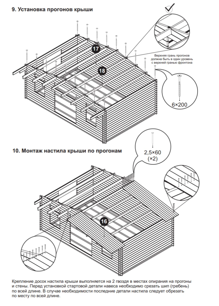 Сделать крышу. У домика двускатная крыша: нужно лишь установить прогоны и поверх них уложить сплошной настил из шпунтованной доски — он также есть в комплекте. В качестве покрытия подойдет любой вариант: обычно выбирают такой материал, который сочетается с покрытиями других построек на участке.