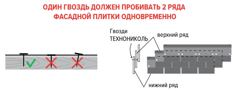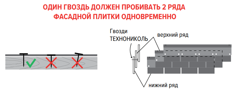 Гвозди забивают строго под прямым углом, чтобы шляпки были на одной плоскости с плиткой, не врезаясь в нее. Каждый гвоздь должен фиксировать два ряда плитки сразу. К плитам XPS плитку прикручивают аналогично, только уже винтами ТЕХНОНИКОЛЬ R16, длиной 50 мм, с диаметром шляпки 25 мм.