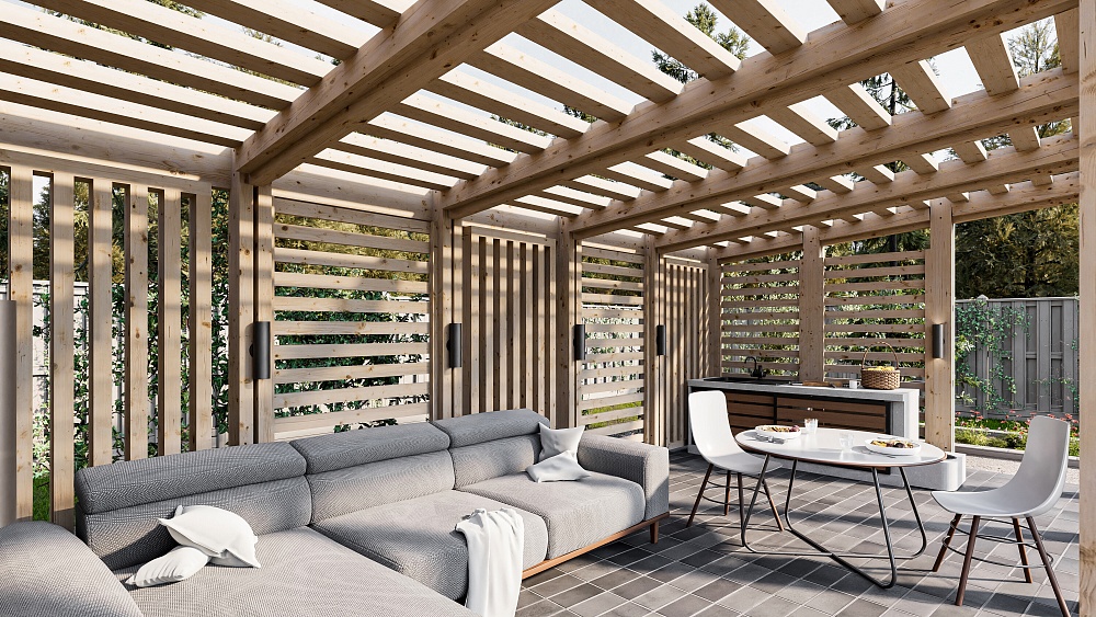 Эта прямоугольная пергола из клееного бруса станет стильным и функциональным дополнением сада или участка. Конструкция состоит из стоек и балок, частично объединённых деревянными решётками, создающими легкую и воздушную структуру. Отсутствие кровельного покрытия позволяет наслаждаться естественным светом, а реечное ограждение обеспечивает приятную тень, защищая от палящего солнца. Пространство под ней идеально подходит для отдыха, создавая уютную атмосферу и гармонично дополняя ландшафт.