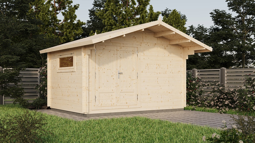 Двускатная крыша, окно-фрамуга и глухие распашные двери формируют просторное и уютное пространство в хозблоке размером 3,9×3 м. Внутренняя площадь 10 м² дополнена широким свесом над входной группой - здесь можно поставить кадки с растениями, разместить в тени крыши садовую мебель. Внутри достаточно места для верстака, стеллажей или любого типа рабочей станции.