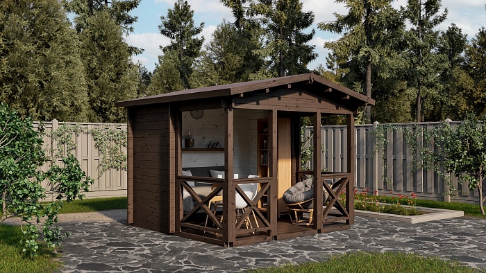 Два контура из мини-бруса с воздушным зазором 100 мм между ними, предусматривающим утепление плитными материалами, что исключает возможность продувания или промерзания стен. Благодаря этому, в таких домах комфортно не только летом но и в межсезонье.