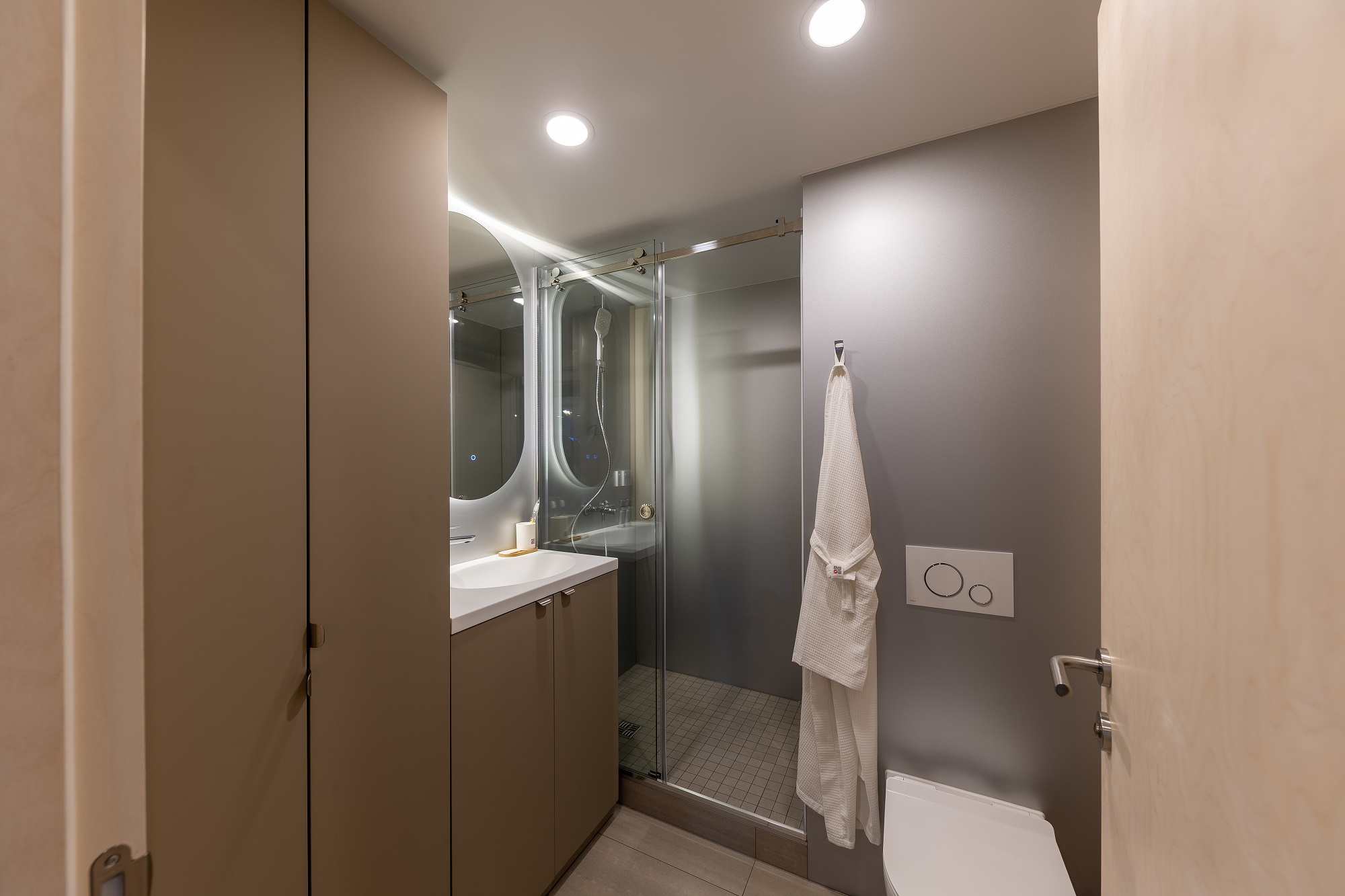 — Душевая кабина из закаленного стекла — Унитаз с инсталляцией — Раковина с интегрированной мойкой — Зеркало с подсветкой — Смесители Ravak — Полотенцесушитель электрический с полкой для полотенец — Держатель туалетной бумаги, крючок для халатов — Шкаф для бойлера с местами для хран