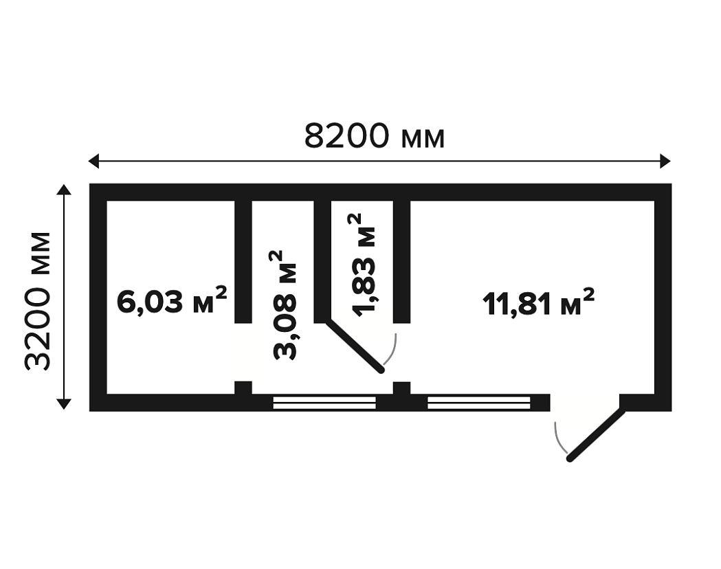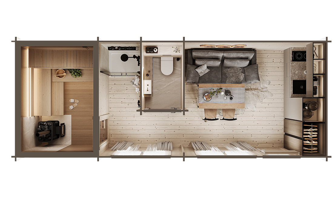 Уютная баня спроектирована с продуманным разделением пространства. В одной части расположены парная, коридор, а также отдельные санузел и душевая. В другой — просторная комната отдыха, где приятно провести время после банных процедур.