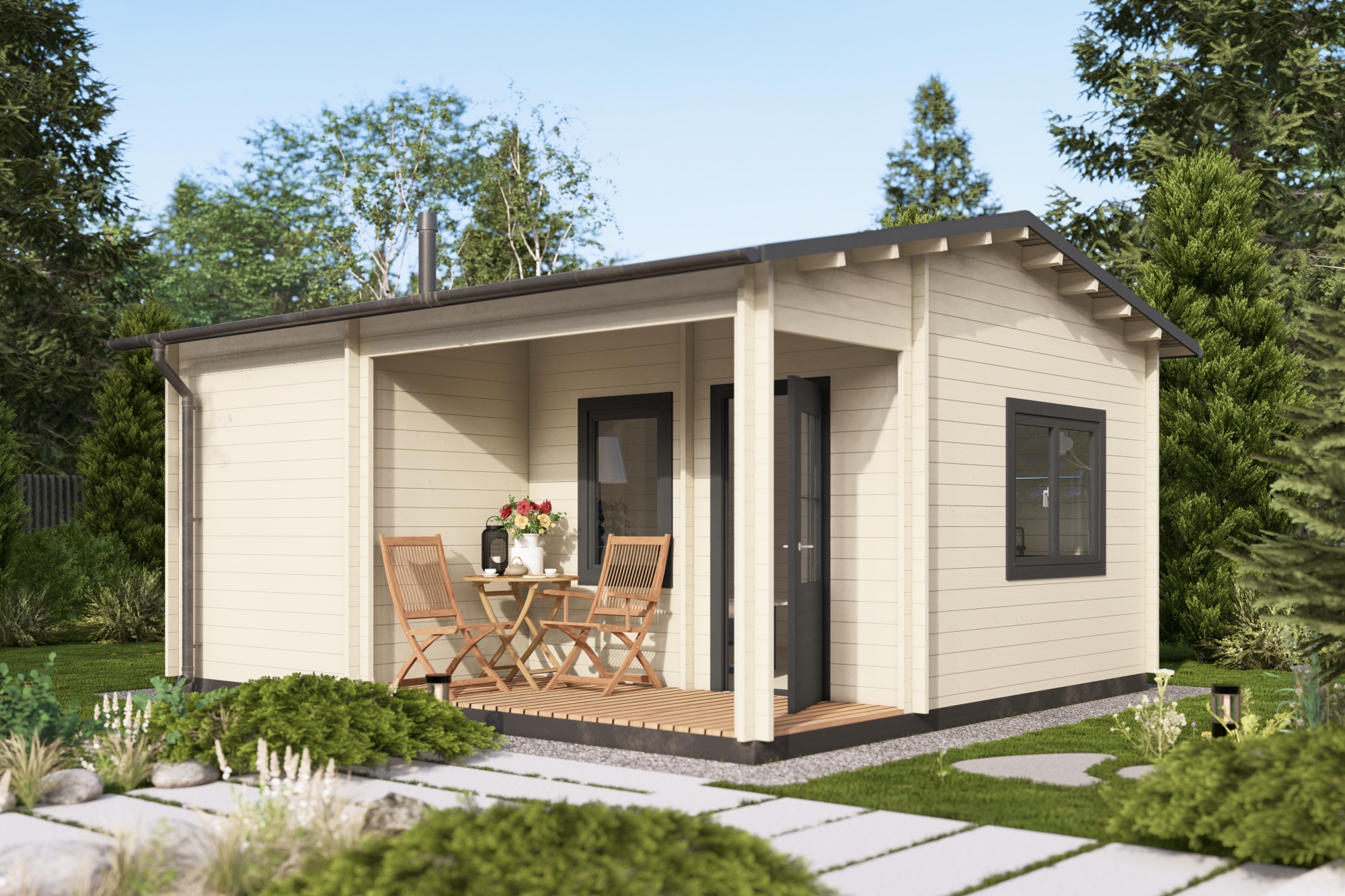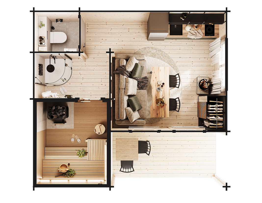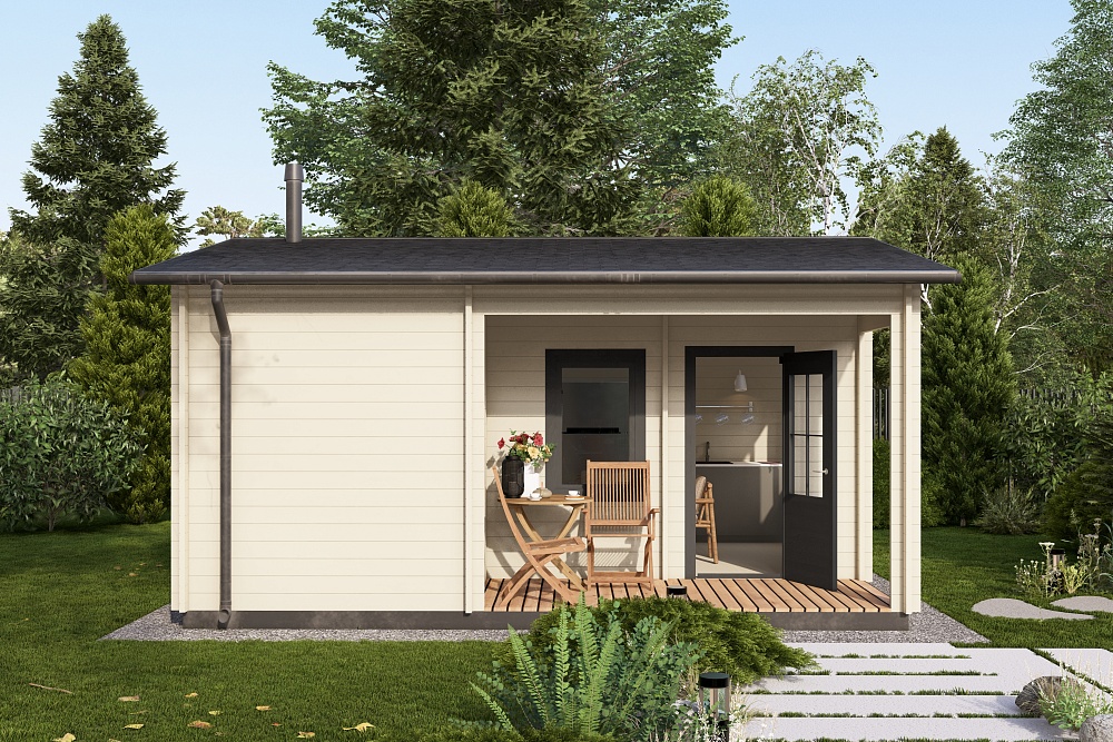 Компактная баня с продуманной планировкой создаёт полноценное пространство для отдыха на даче: парная, уютная комната отдыха и отдельный санузел с помывочной собраны в одном тёплом и светлом домике. Такое решение легко вписывается даже в небольшой участок и позволяет быстро получить готовое место для настоящего расслабления.