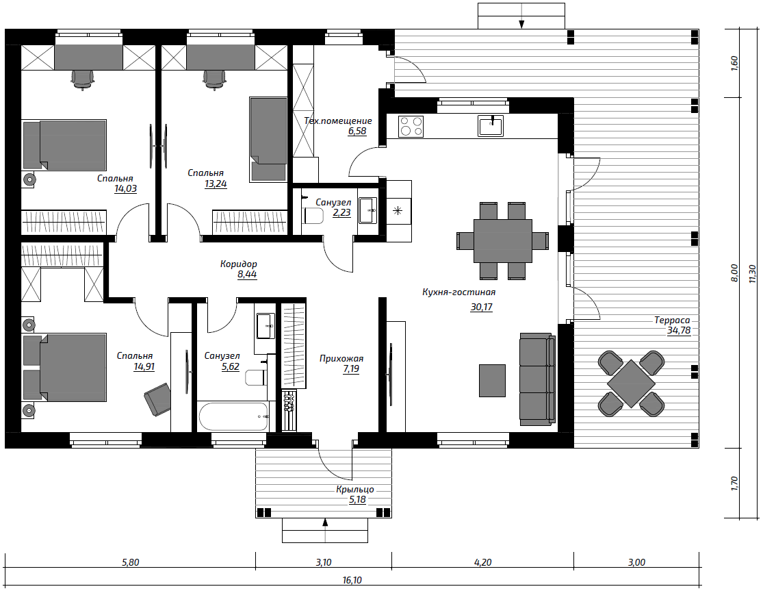 Просторный и стильный дом, где каждая деталь продумана для вашего комфорта. Мастер-спальня с гардеробной создаст уютное и приватное пространство. Две дополнительные спальни, светлая кухня-гостиная и просторная прихожая формируют гармоничное пространство для жизни. Два санузла и техническое помещение добавят удобства, а уютная терраса станет идеальным местом для отдыха на свежем воздухе.