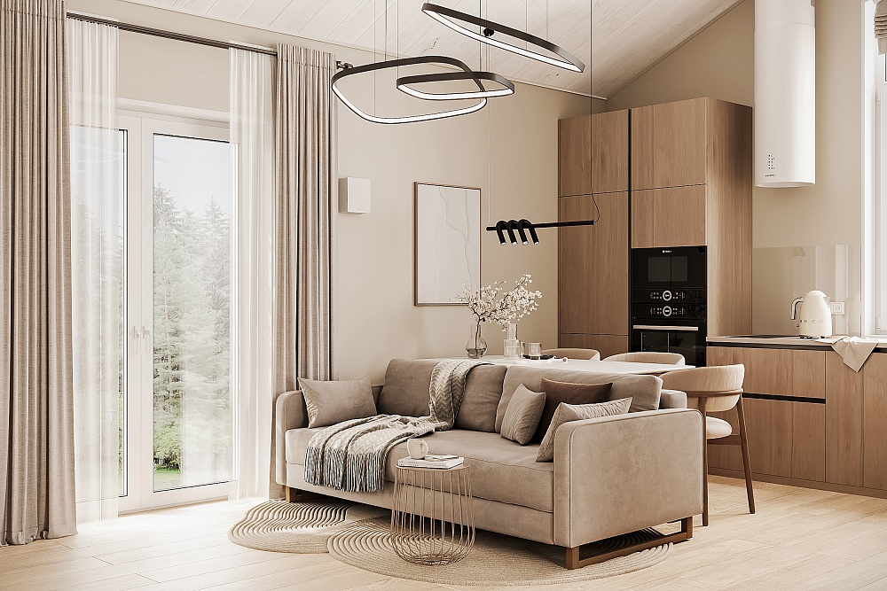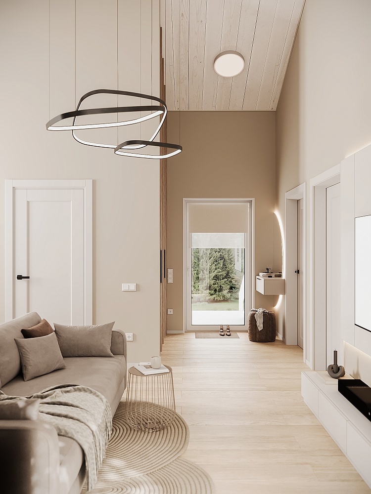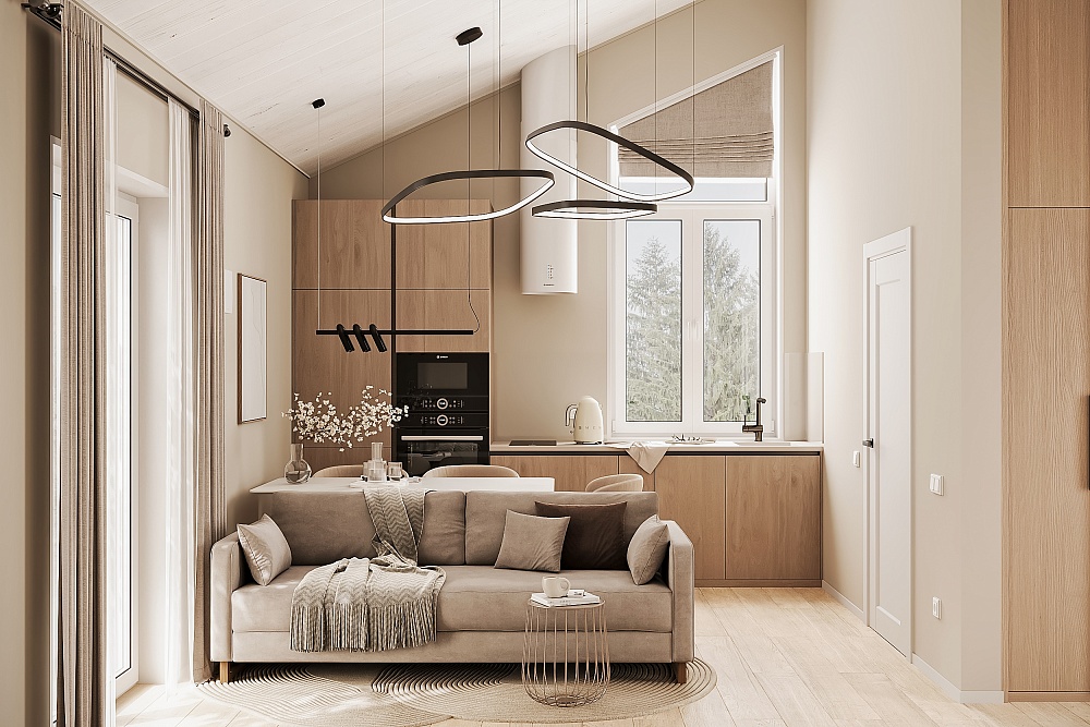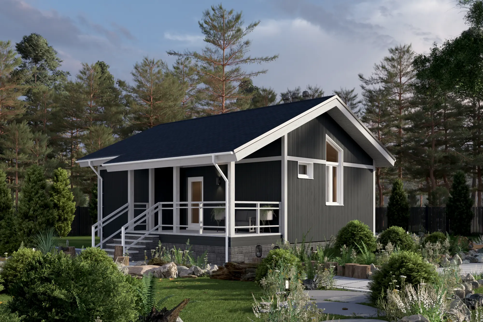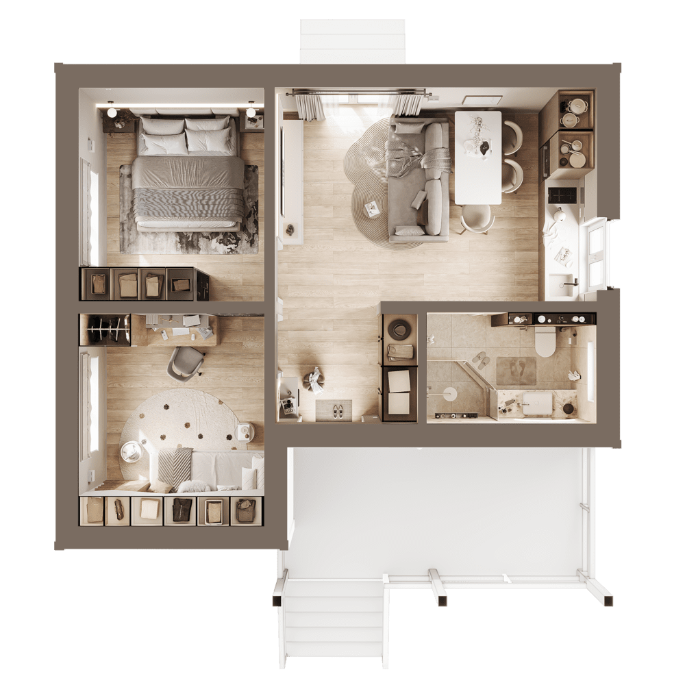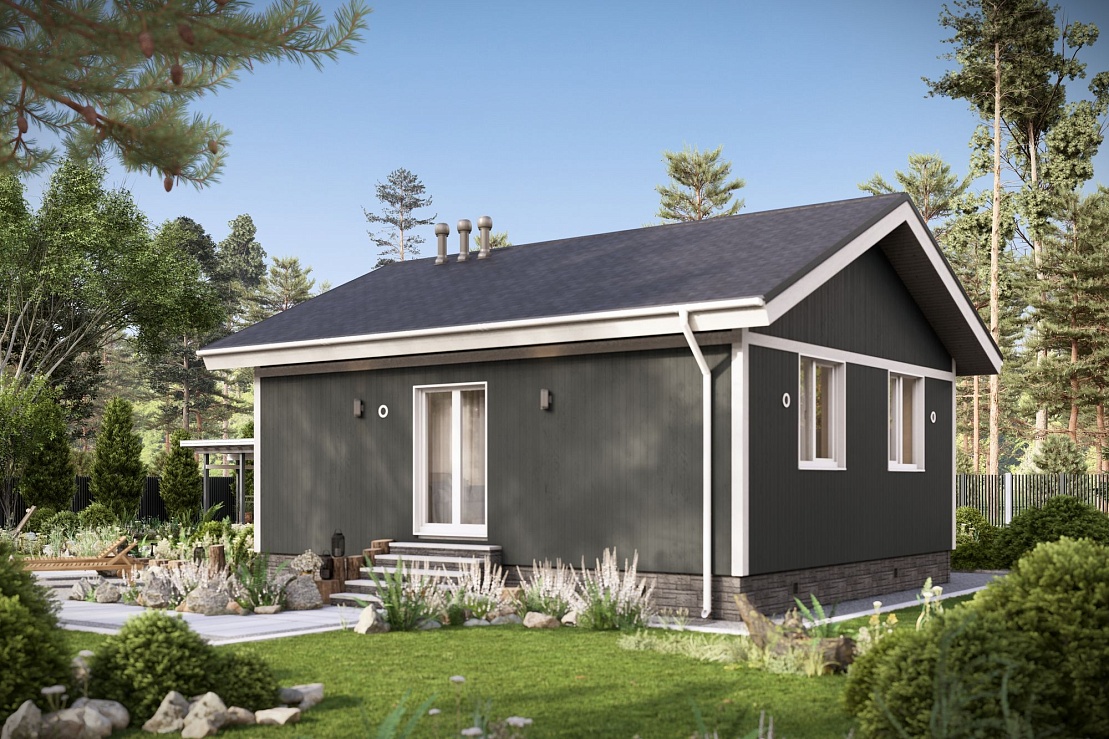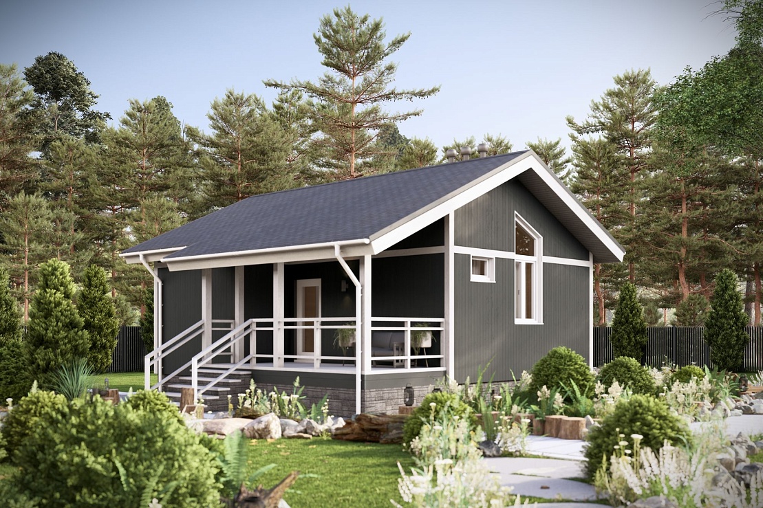 Планировка включает две спальни, совмещенную кухню-гостиную и террасу. Дом оснащен двумя входами: основной вход ведет в жилую зону, дополнительный — на террасу. Пространство спроектировано для комфортного проживания, с учетом функциональности и эргономики.