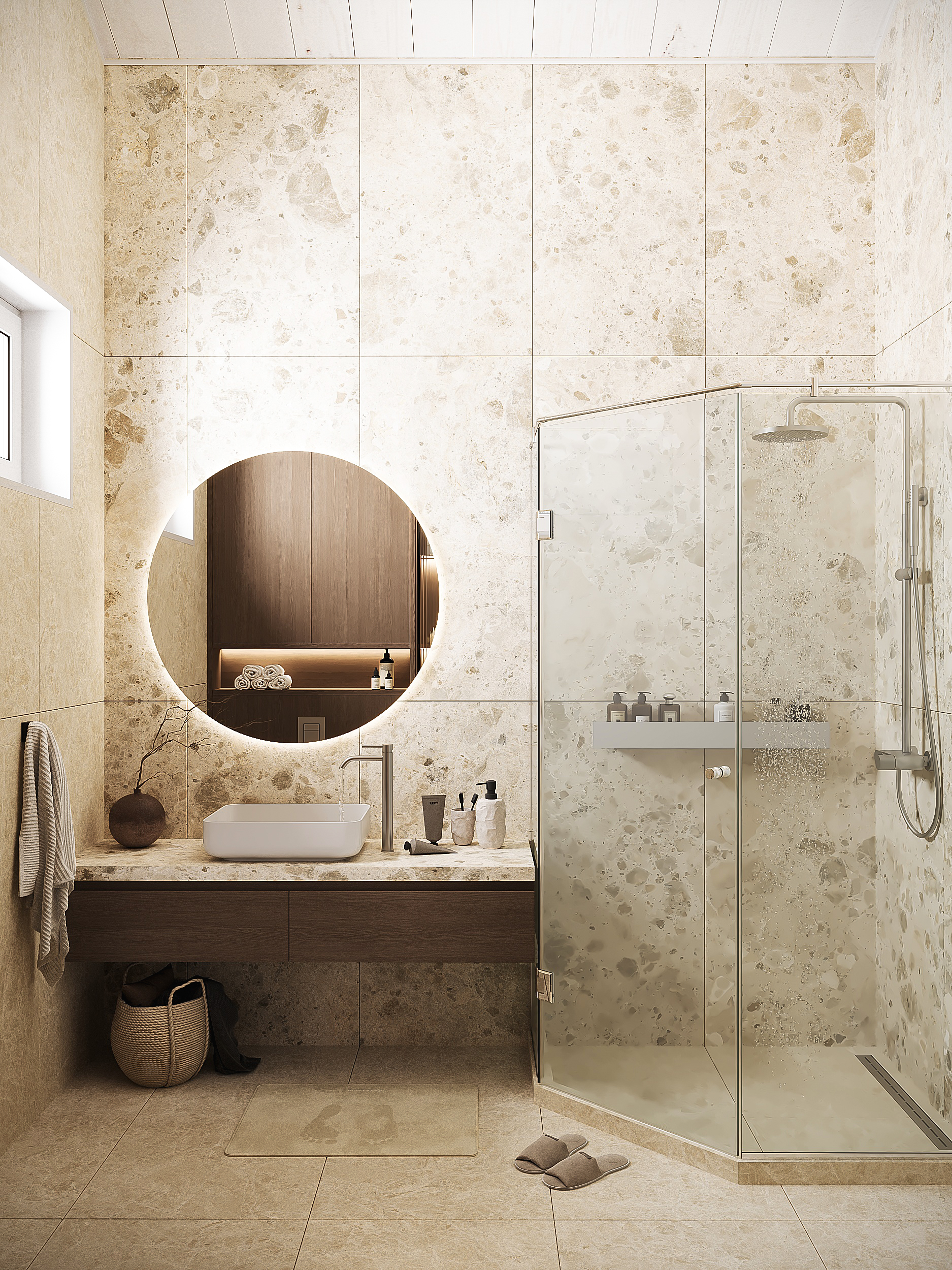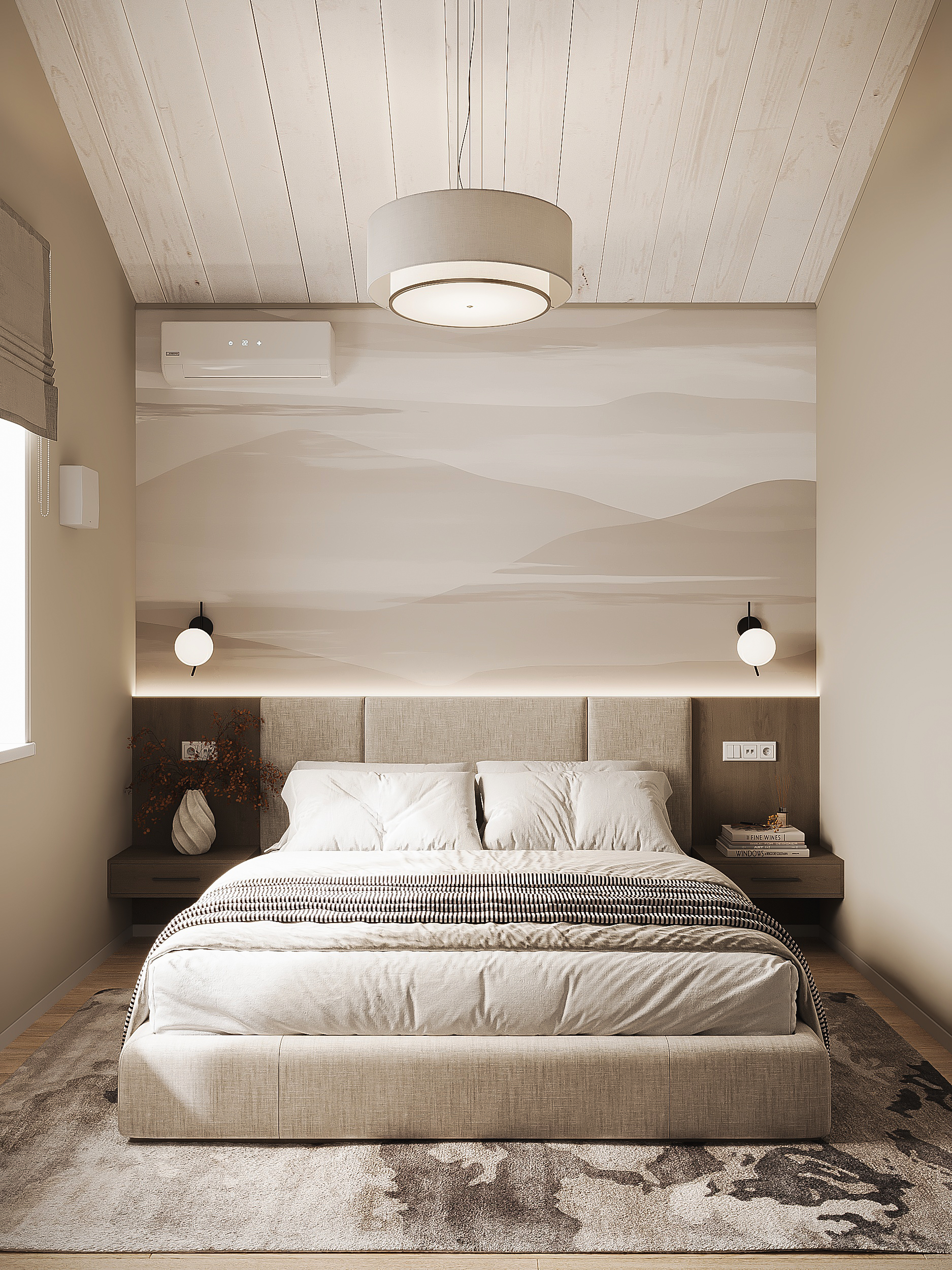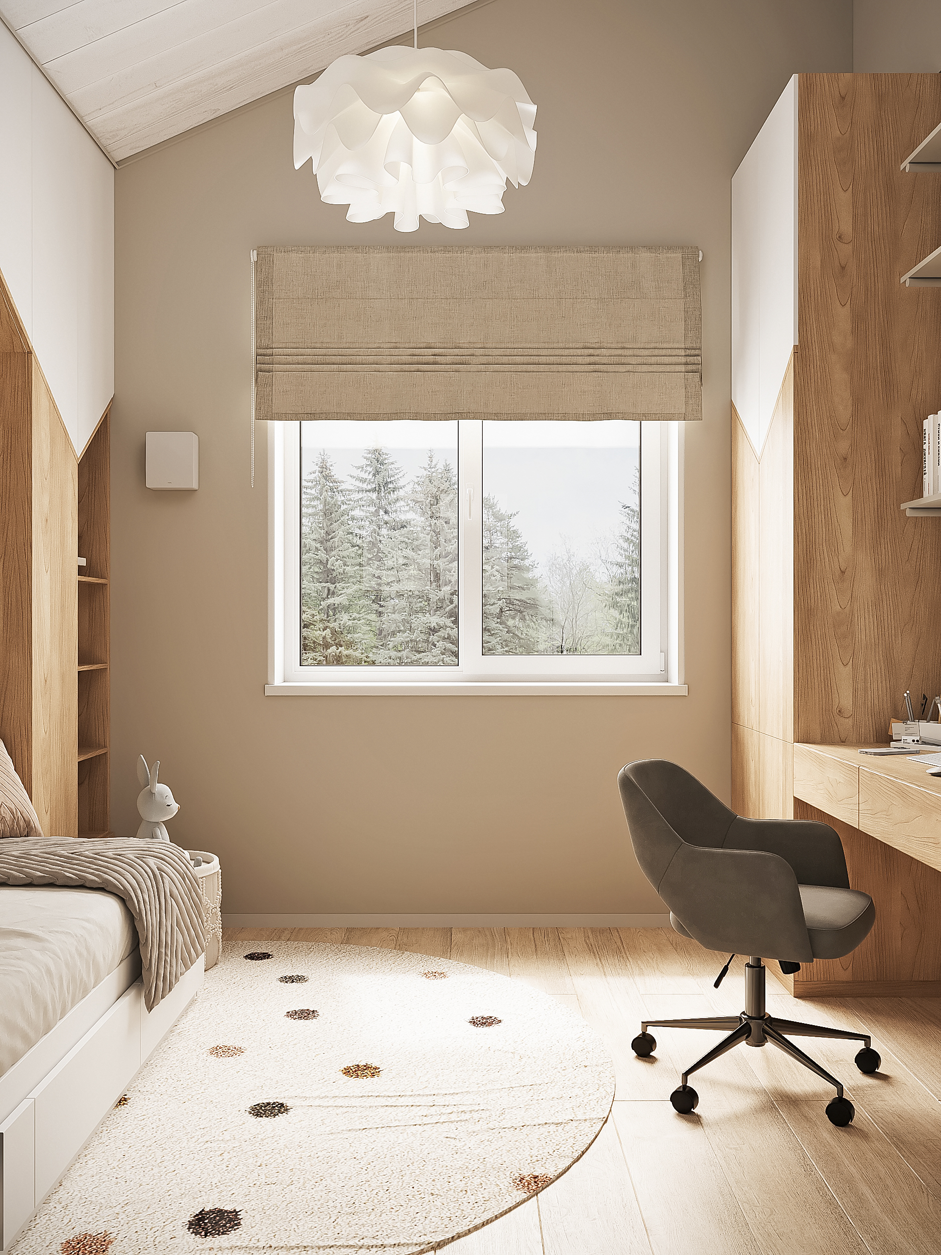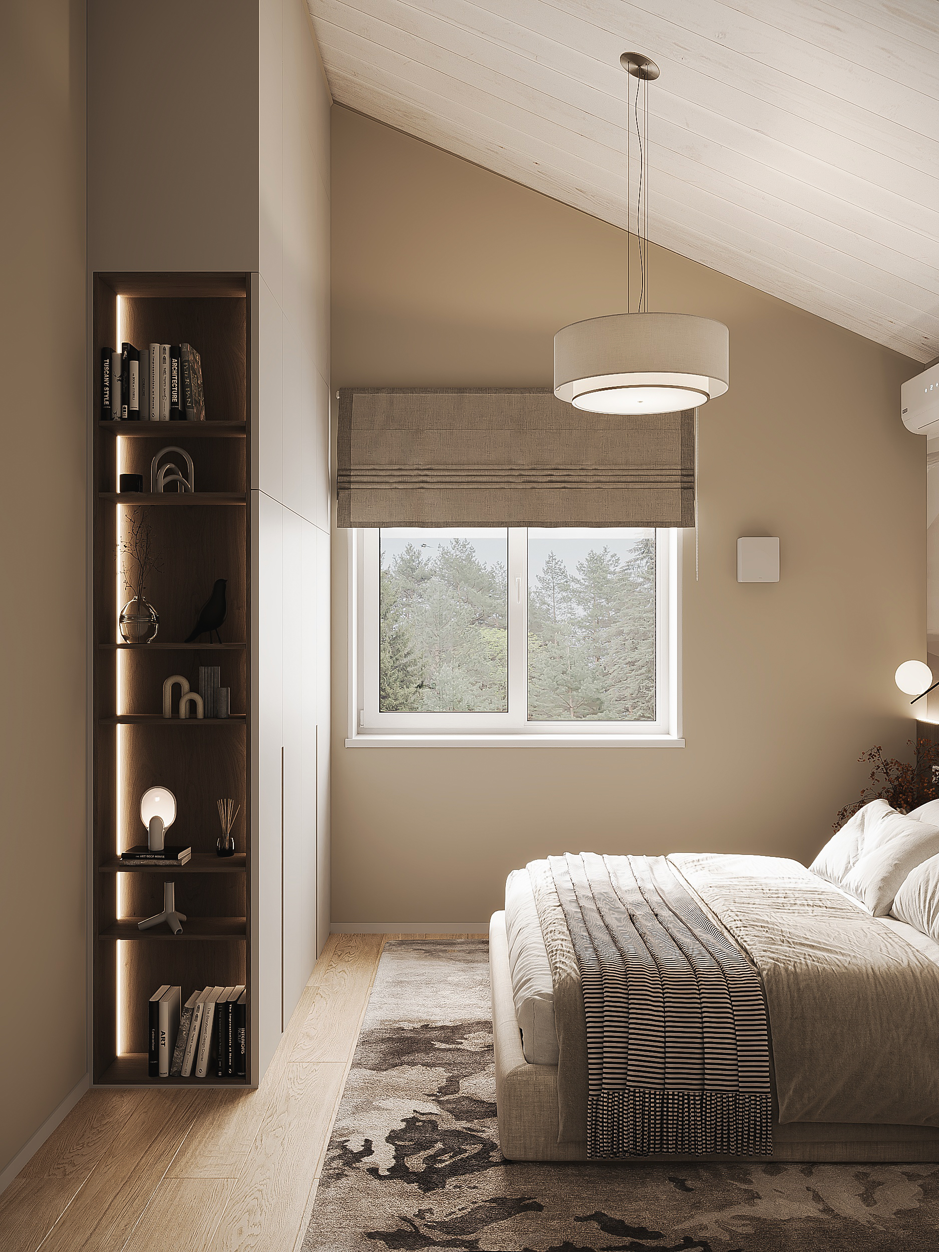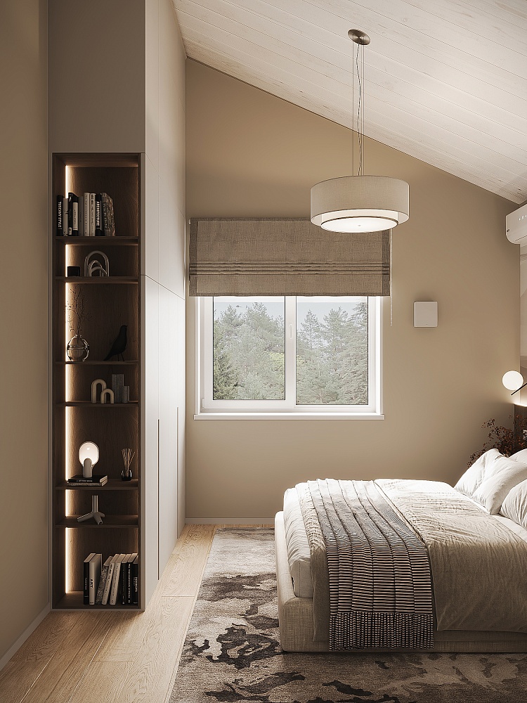 Планировка включает две спальни, совмещенную кухню-гостиную и террасу. Дом оснащен двумя входами: основной вход ведет в жилую зону, дополнительный — на террасу. Пространство спроектировано для комфортного проживания, с учетом функциональности и эргономики.