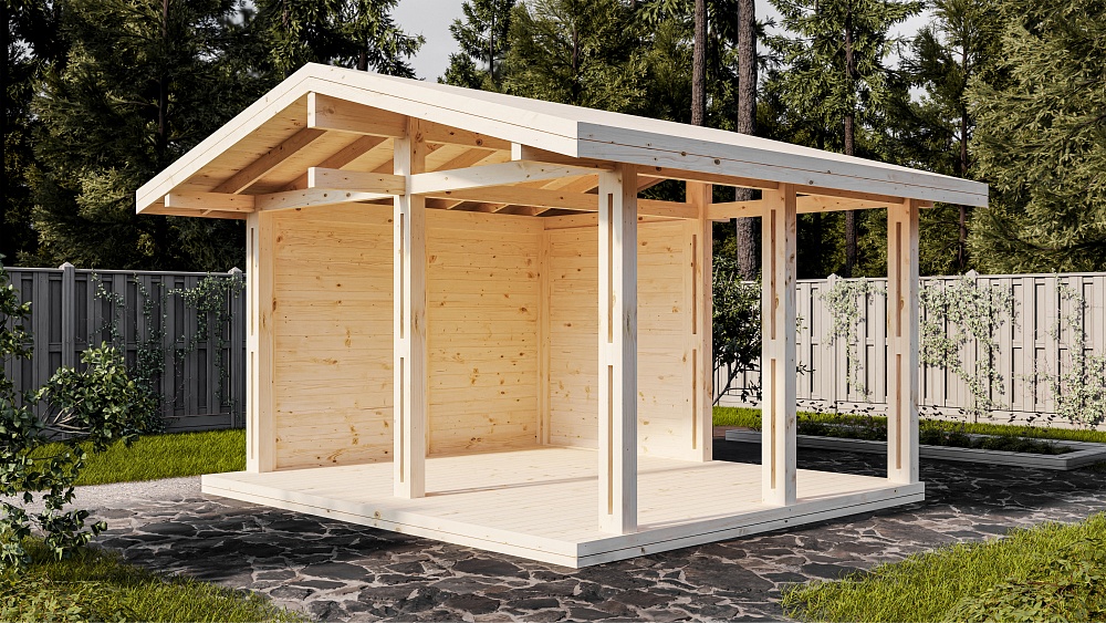 Уютная открытая беседка площадью 18 кв.м. защитит от солнечных лучей и внезапного дождя. Полторы стены беседки закрыты, что придаёт ей ощущение уединения и защищённости, в то время как остальные остаются открытыми, предоставляя возможность установить мягкие окна для дополнительной защиты от ветра. Внутри можно с комфортом разместить гриль-зону с дымоходом. Двойные опорные балки, поддерживающие всю конструкцию, добавляют беседке воздушности. Эта беседка подойдет для семейных обедов или дружеских встреч, подарив множество незабываемых моментов, наполненных теплом и уютом.