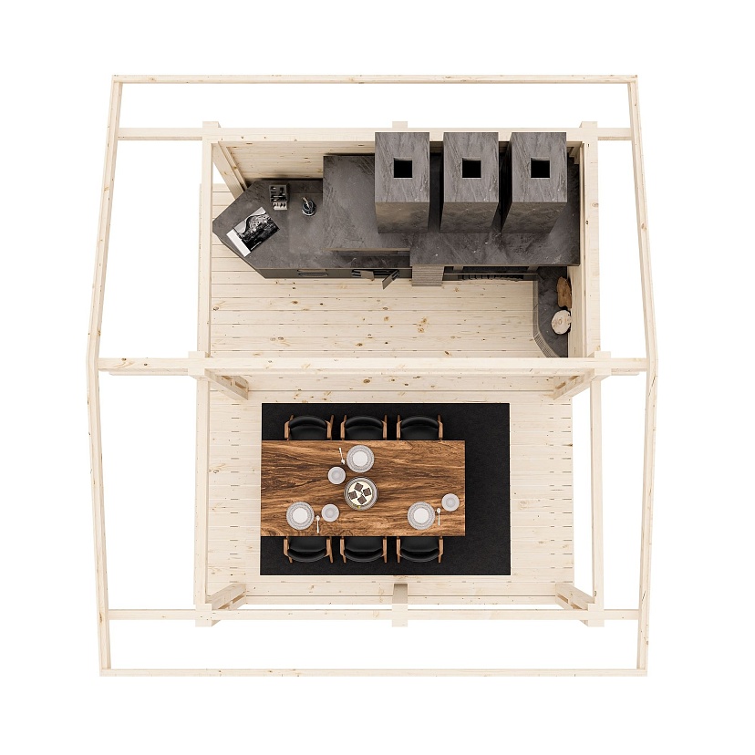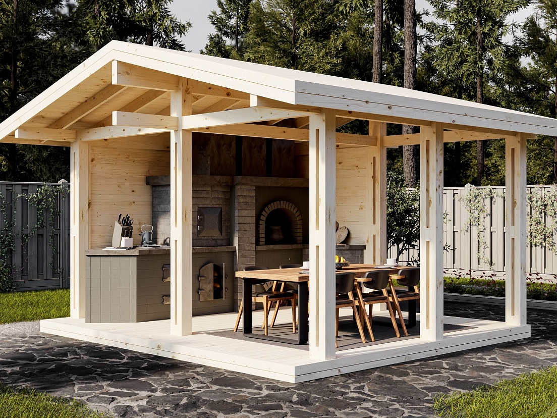 Уютная открытая беседка площадью 18 кв.м. защитит от солнечных лучей и внезапного дождя. Полторы стены беседки закрыты, что придаёт ей ощущение уединения и защищённости, в то время как остальные остаются открытыми, предоставляя возможность установить мягкие окна для дополнительной защиты от ветра. Внутри можно с комфортом разместить гриль-зону с дымоходом. Двойные опорные балки, поддерживающие всю конструкцию, добавляют беседке воздушности. Эта беседка подойдет для семейных обедов или дружеских встреч, подарив множество незабываемых моментов, наполненных теплом и уютом.