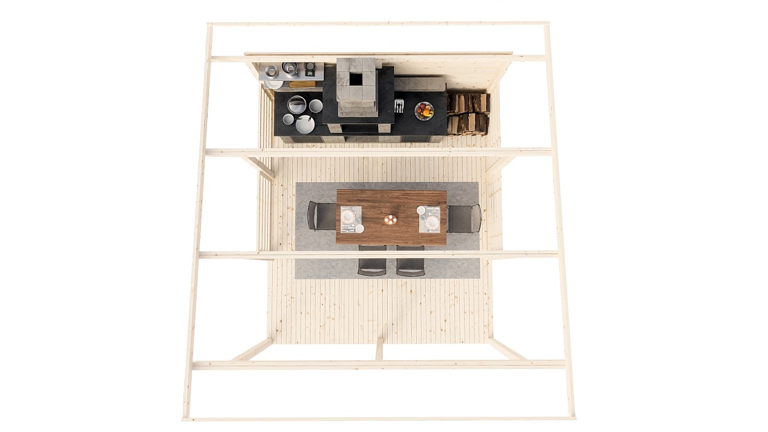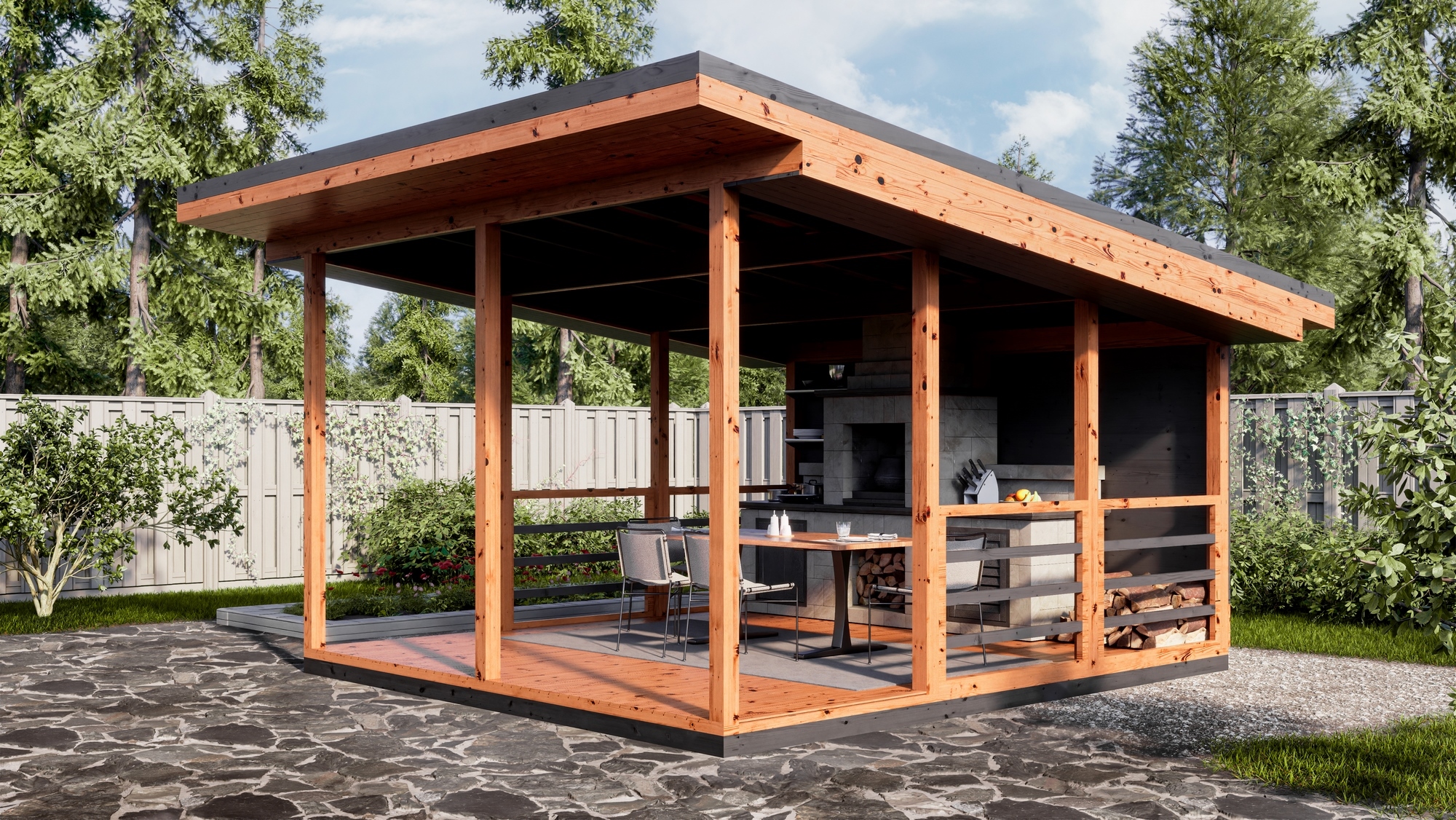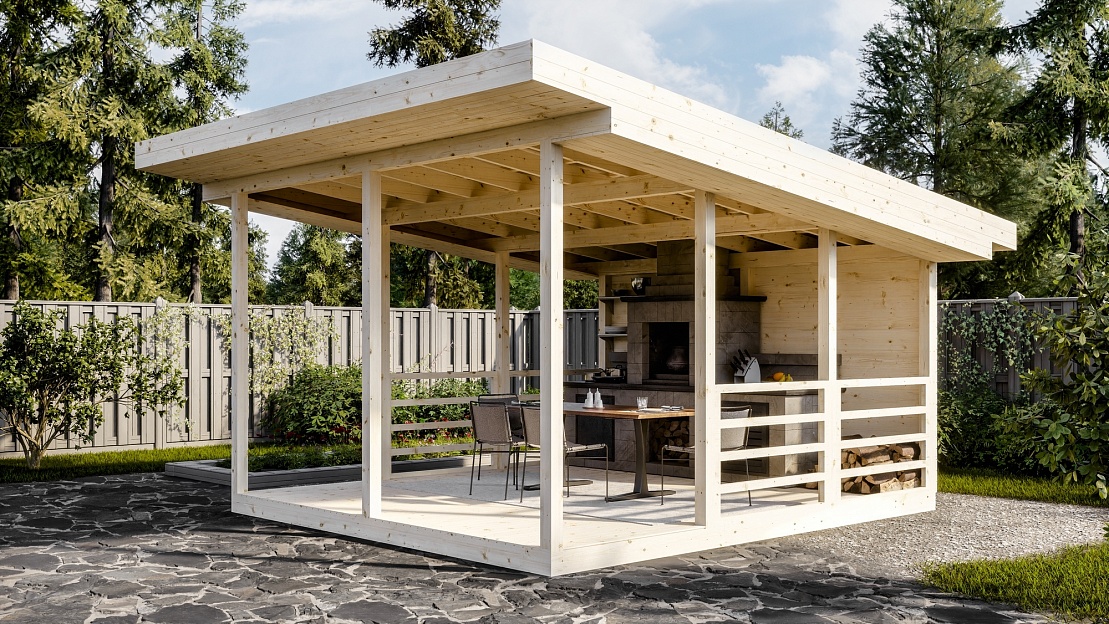 Площадь беседки позволяет комфортно разместиться компании из нескольких человек. Открытые стены дают возможность установить мягкие окна для дополнительной защитят от ветра. Ограждения по двум сторонам создают ощущение безопасности и комфорта. На фоне глухой стены можно организовать кухонную зону или гриль-зону, что добавит удобства и разнообразит отдых на природе.