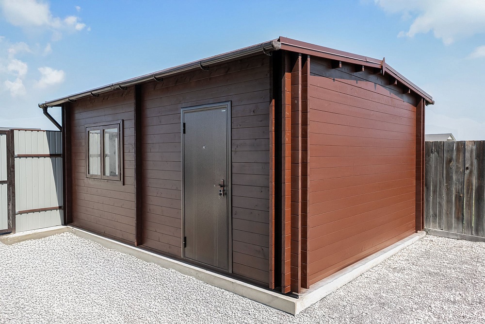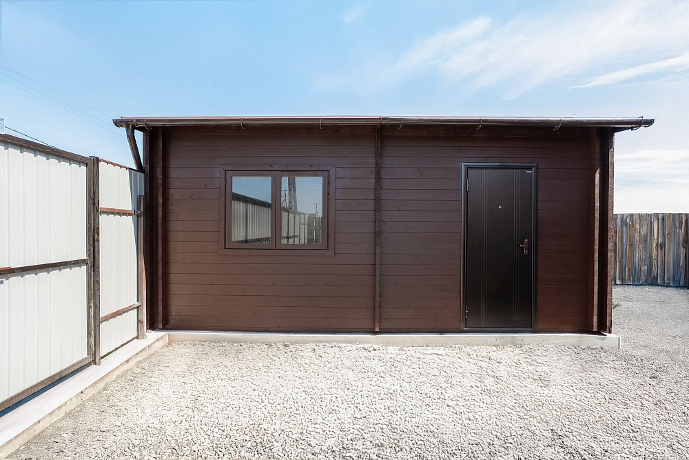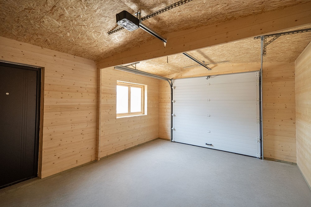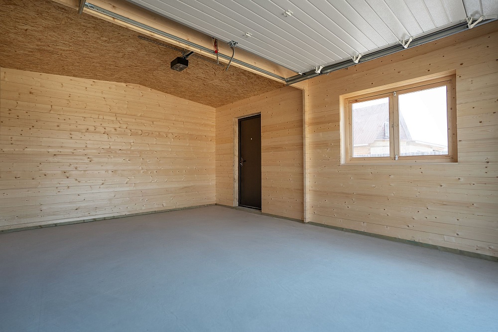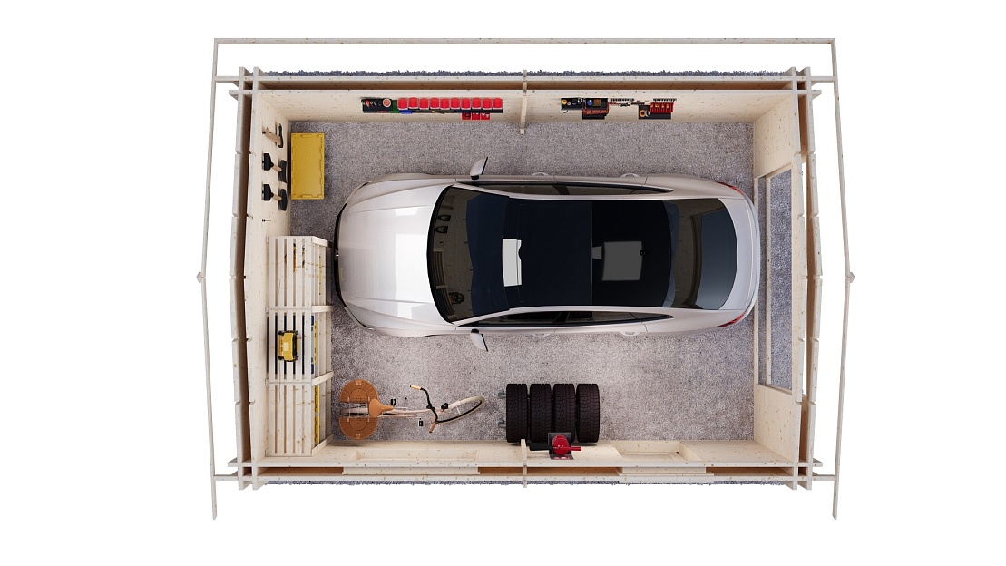 Компактный гараж 4,5×6 м, общей площадью 21 м2 рассчитан на 1 автомобиль. Стены выполнены из двойного бруса, что позволяет произвести внутристенное утепление при необходимости. Для удобства использования в гараже предусмотрено одно распашное окно и отдельный вход с дверью.