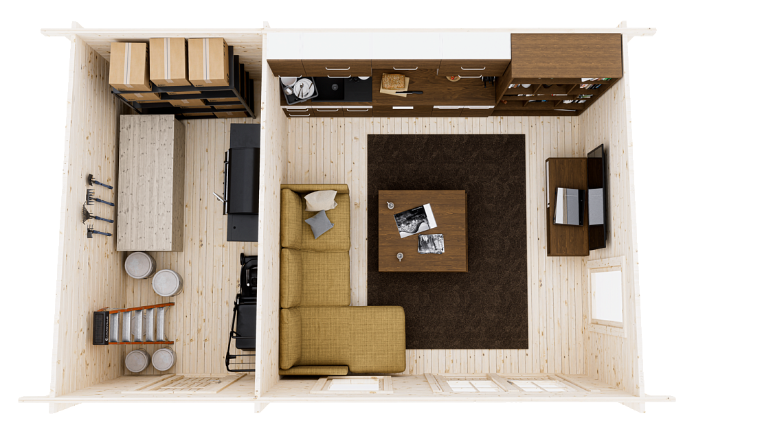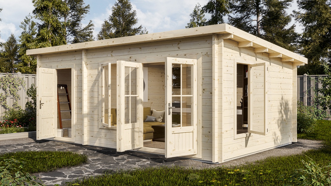 Садовый дом размером 5,8х4,2 м с общей площадью 21,5 м² разделен на две функциональные зоны: просторное помещение площадью 14,6 м², идеально подходящее для создания уютной гостиной, столовой или игровой, и хозблок площадью 6,9 м² с глухой дверью, который обеспечит надежное хранение всего необходимого, скрывая его от любопытных глаз.
